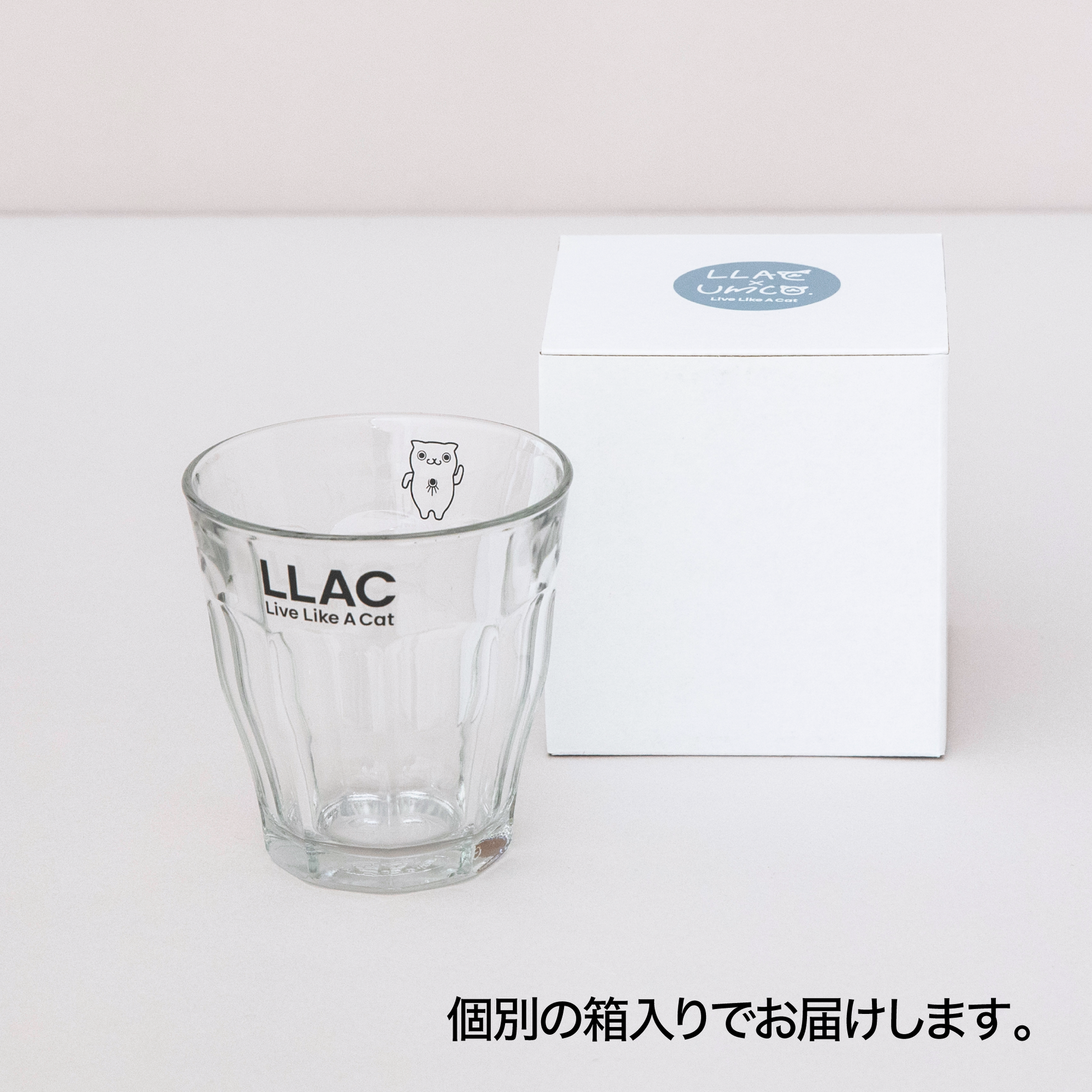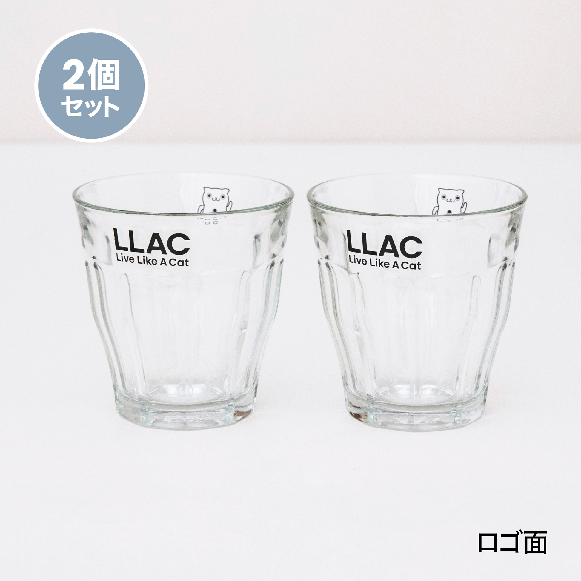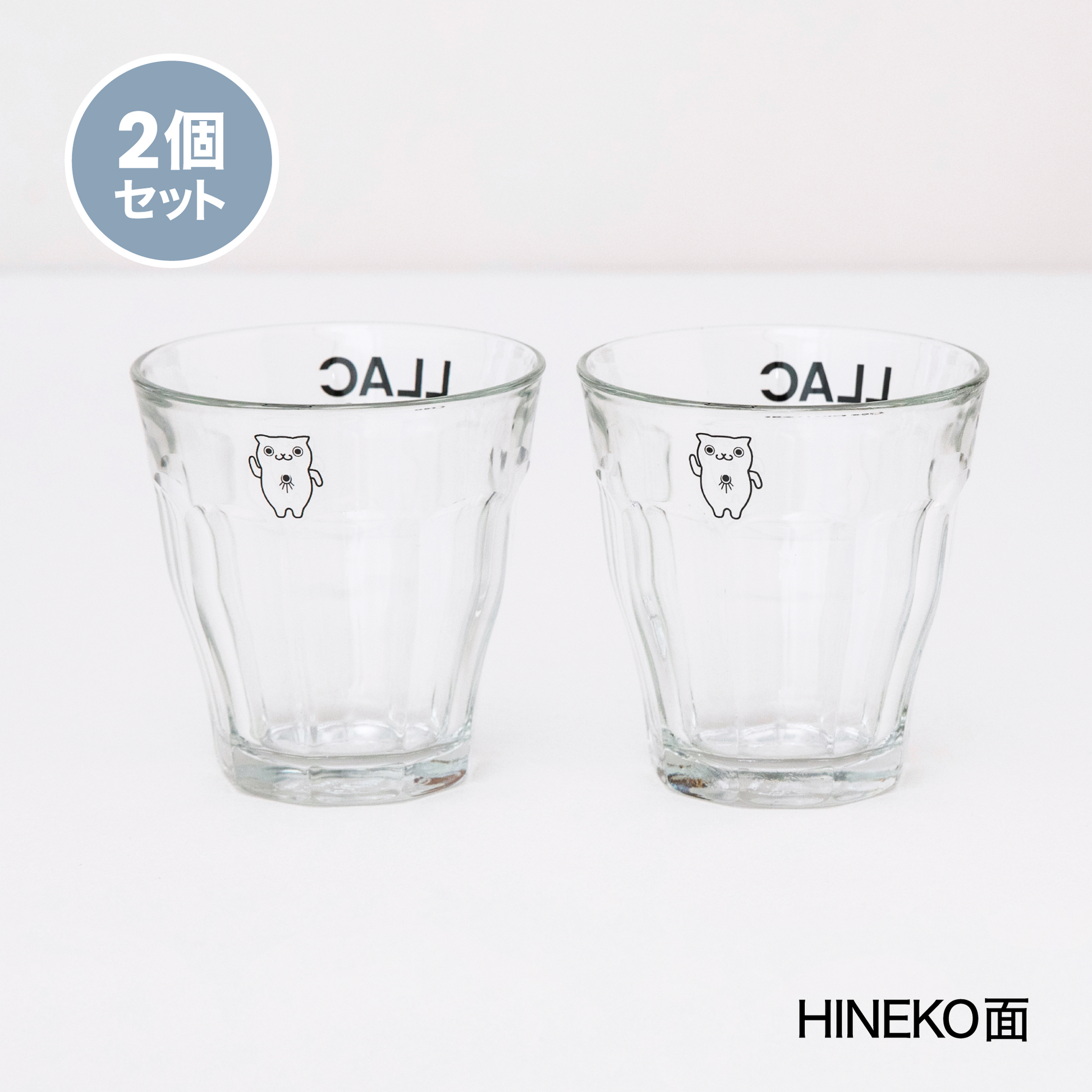 フランスのガラス製品メーカー・デュラレックスの伝統ある人気モデル「ピカルディ」に、LLACのロゴとHINEKOをブラックの線画でスタイリッシュにデザインしたグラスの2個セット。
