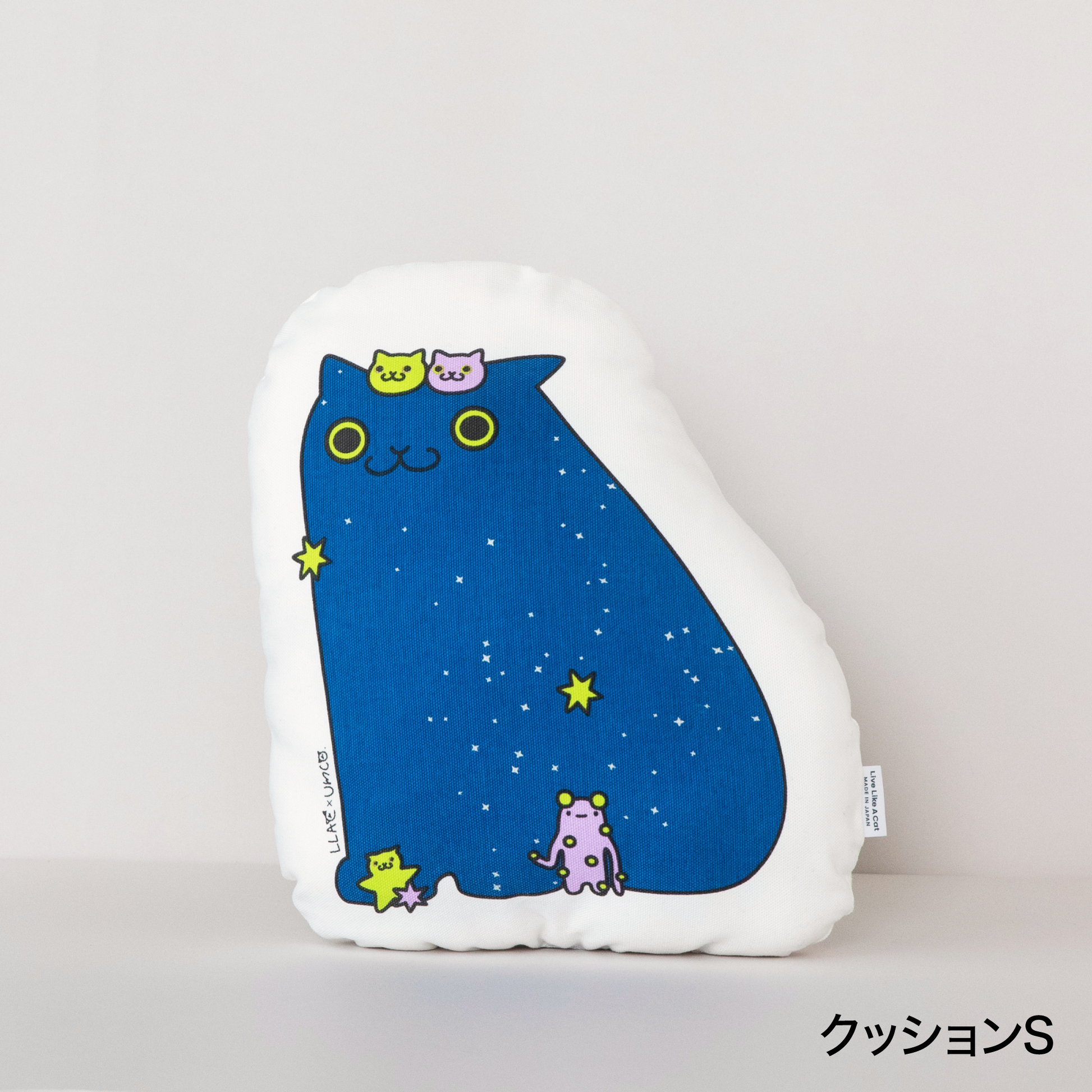 宇宙にきらめく星々を宿した大きな猫がひと際目を引く、コットン100%の「BAFUO」クッション。神秘的でありながら、小さな猫や仲間たちで可愛さもプラス。ハンドプリントで色の再現にとことんこだわったクッションは肌触りもよく、ダイカットで猫の形にかたどられ、他にはないLLACならではのアイテムです。